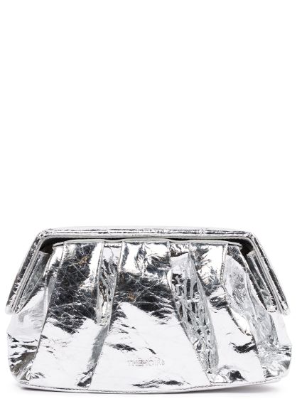 The Afrodite Pineapple clutch from THEMOIRÈ shines in metallic silver vegan leather with a crinkled finish. Textured pleating defines the surface, while a hinged top and hidden frame keep things sleek and functional.