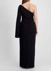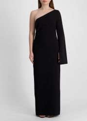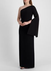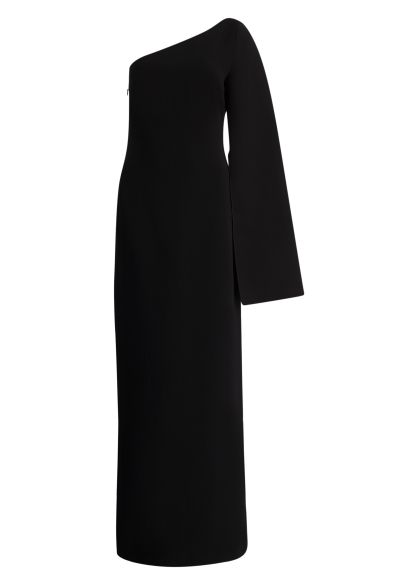 The Alina gown from Solace London captivates with its one-shoulder silhouette and sculpted sleeve that flares into a dramatic bell shape. Crafted in sleek crepe, this figure-skimming style is finished with a subtle back split for graceful movement.