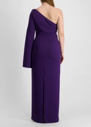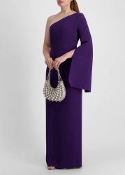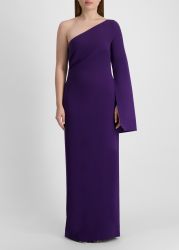 Solace London delivers architectural elegance with the Alina gown, shaped by a one-shoulder bodice and a fluid flared sleeve. The clean column skirt in structured crepe brings balance to the bold silhouette, making a refined statement.