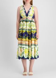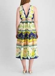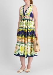 The Amazon Garden midi dress by Farm Rio captures the spirit of tropical escape with its vibrant palette and lush floral and jungle motifs. Crafted from a linen blend, this sleeveless style boasts a deep v-neck, playful front cut-outs, and a flowy skirt that moves with grace.
