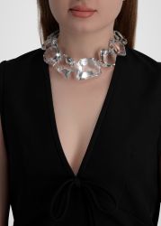 The Bina necklace from Monies showcases oversized acrylic forms arranged in a rhythmic composition, transforming simplicity into wearable art.