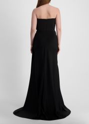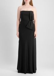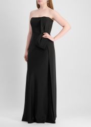 This gown from Alex Perry is crafted from satin crepe with a sleek strapless profile that drapes into a fluid skirt, elegantly sweeping the floor. A statement bow placed at the bodice heightens the sense of modern elegance.