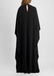 This kaftan by Zuhair Murad reflects regal sophistication, crafted from fluid crepe that drapes effortlessly. The design features an ornately crystal-embellished neck with intricate, interlaced patterns that shimmer with light, framing the flowing silhouette in timeless elegance.