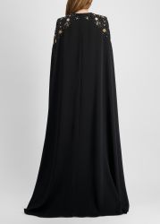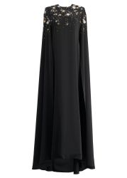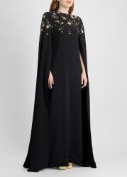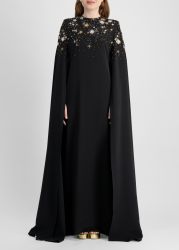 This kaftan from Zuhair Murad evokes celestial allure, tailored in fluid crepe with a cascade of hand-embroidered gold and silver star motifs that shimmer like constellations across the night sky, flowing into a floor-length silhouette with cape sleeves for a regal finish.