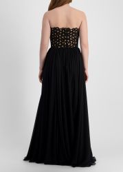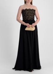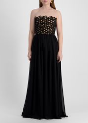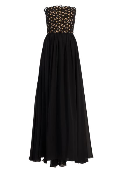 This gown from Elie Saab is crafted from a silk blend, defined by a strapless bodice overlaid with sculptural looped embroidery that creates an intricate, dimensional texture. The gathered full-length skirt falls in fluid waves, adding graceful contrast to the bold detailing above.