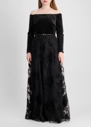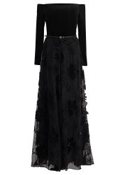 This gown from Elie Saab pairs a sleek off-the-shoulder velvet bodice with a sheer tulle skirt embroidered in tonal floral motifs. The floor-length silhouette is cinched at the waist with a delicate leather belt, balancing structure and romantic allure.