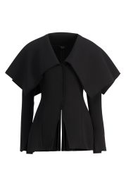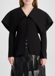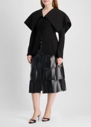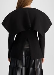 The top from A.W.A.K.E. Mode is tailored from a wool blend with sculptural precision, defined by exaggerated layered shoulders and raw-edge detailing. Its open-front cut adds a modern, deconstructed twist to the dramatic silhouette.