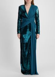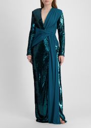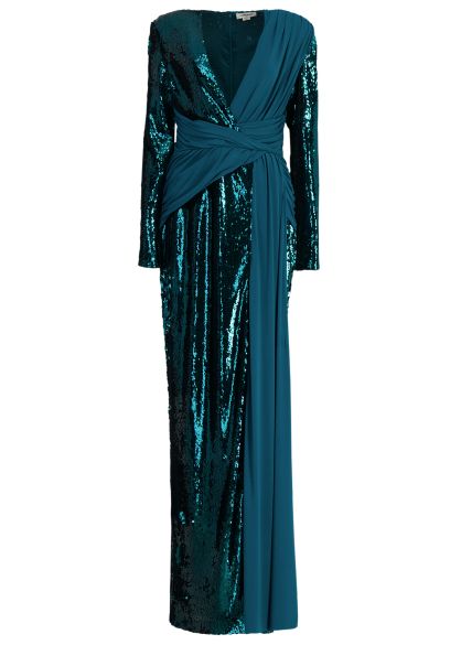 This maxi dress from Zuhair Murad captures a sense of modern opulence through its interplay of sequins and pleated jersey. Elongated sleeves offset the plunging neckline, while the artfully gathered waist accentuates the figure before falling into a split column skirt.