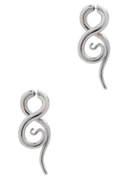 The Boa drop earrings from Panconesi reinterpret organic movement with a bold sculptural twist, featuring a sinuous silver-tone form that coils fluidly into an elongated silhouette.