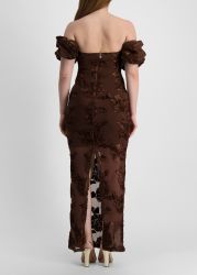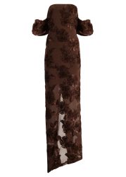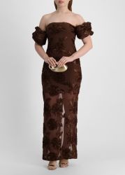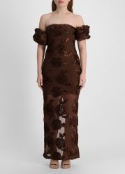 This maxi dress from ROTATE Birger Christensen captivates with its romantic allure, adorned with tonal floral motifs that bloom across a sheer mesh canvas. The off-the-shoulder neck and sculpted silhouette flow with effortless grace, striking a perfect balance between sensuality and sophistication.