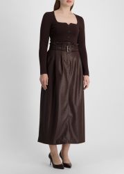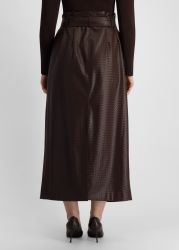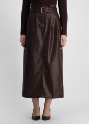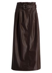 This skirt from ROTATE Birger Christensen is crafted from glossy faux leather with a woven texture, featuring a paperbag waist cinched by a statement buckle belt and falling to a mid-calf hem finished with a back split.