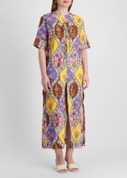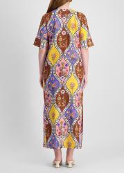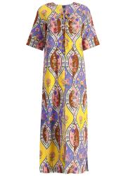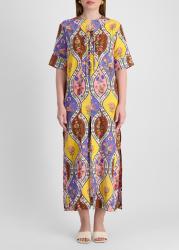 The Calista dress from Borgo De Nor is crafted from a breathable cotton-linen blend, adorned with a vibrant patchwork of vintage-inspired floral panels. This relaxed slip-on style featured a lace-up neck, elbow-length sleeves, and a straight maxi skirt finished with side splits.