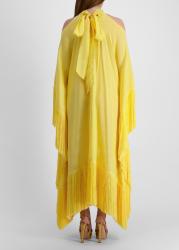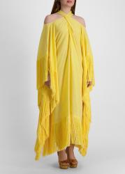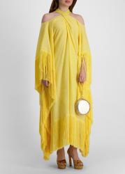 The Bambolino kaftan dress from Taller Marmo captures sun-drenched elegance in a bright lemon hue. Crafted from breezy linen, this maxi style features a halter neck with rear ties and a relaxed silhouette, framed by cascading fringes that bring fluid movement and a bold, glamorous finish.