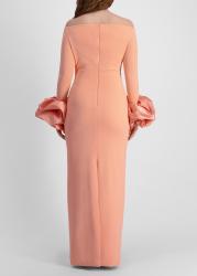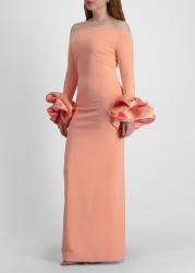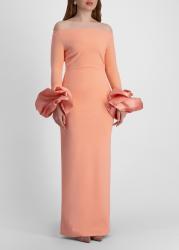 The Talia gown from Solace London sculpts the feminine form in smooth crepe with a sleek column silhouette and an off-the-shoulder bodice. Dramatic satin faille cuffs bloom at the wrists, adding an architectural flourish to the minimalist design.
