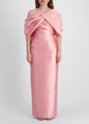 Crafted from lustrous faille, the Davina gown from Solace London pairs clean lines with sculptural elegance. An asymmetric off-the-shoulder draped panel wraps the neck, while the fitted bodice falls to a sleek column silhouette.