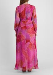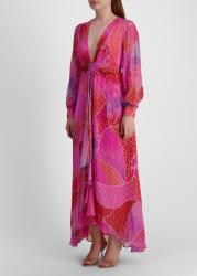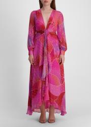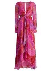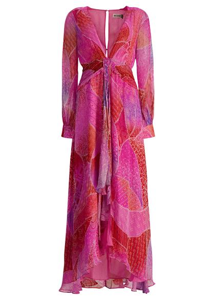 The Meera gown from Rixo is crafted from lightweight crinkled chiffon and showcases a vibrant patchwork print. Blouson sleeves and a plunging neck strike a romantic balance, while a bias-cut skirt with a front split adds graceful movement.