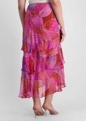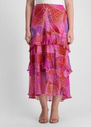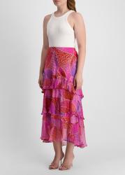 The Preslee midi skirt from Rixo showcases a vibrant patchwork-inspired placement print, brought to life on fluid crepe de chine with tiered chiffon ruffles that sway with every step.
