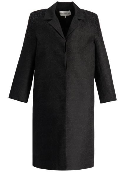 Crafted from black jacquard fabric embellished with tonal beads for a shimmering finish, this Stine Goya coat blends classic tailoring with a hint of quiet glamour. A sharp lapel collar and concealed placket complete the sleek, single-breasted silhouette.