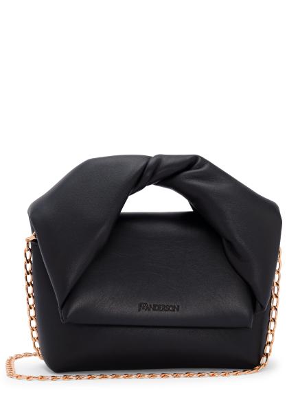 The Twister bag by JW Anderson features a sculptural fold-over silhouette in soft leather, finished with a twisted top handle and a detachable gold-tone chain for versatile styling.