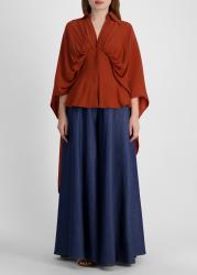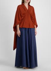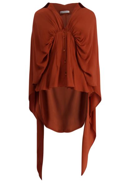 The Resilient Shirt from Palmer//Harding is cut from fluid crepe, featuring a collared V-neck and a tailored slim silhouette. Artful gathering at the front flows into draped panels that cascade like a cape at the back.