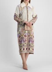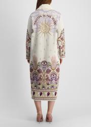The Written In The Stars coat from Hayley Menzies is knitted in metallic jacquard, depicting a tapestry of eyes, hands, stars, and florals. A plush faux fur collar crowns the design, adding both texture and warmth to its opulent silhouette.