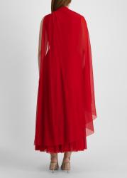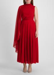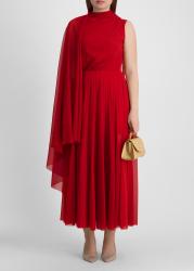 The Lucy maxi dress from Dalood is crafted in vivid red, shaped with soft draping across the bodice and a sleeveless cut. A floor-length silhouette flows from the gathered waist, while a single trailing cape panel lends dramatic movement.