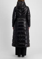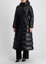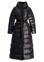The Calina coat from Mackage is crafted from recycled lustrous down in a fitted a-line cut, with contrast chevron quilting that defines its statement silhouette. A tonal sash belt cinches the waist, while an adjustable storm visor hood, insulated pockets, and rib-knit cuffs ensure warmth and protection in the cold.