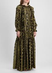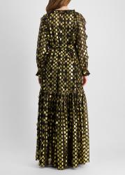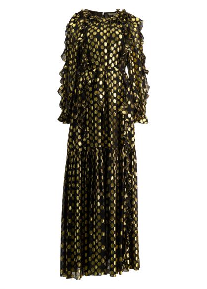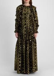 The Celestina gown from Ulla Johnson radiates celestial glamour, crafted from silk-blend fabric woven with glimmering gold fil coupé dots. Romantic ruffles trace the neckline and sleeves, while a softly gathered waist flows into a tiered, floor-length skirt.