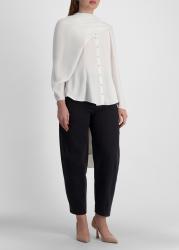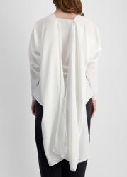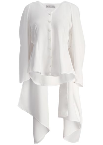The In Your Arms shirt from Palmer//Harding is crafted from fluid ivory crepe with an artful silhouette that redefines modern draping. Elongated sleeves cascade beyond the shoulders, transforming into flowing panels that can be tied as a scarf, swept cross-body, or left to trail behind like a cape.