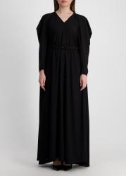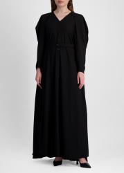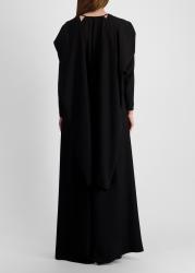 The In Your Arms maxi dress from Palmer//Harding is crafted from fluid black crepe featuring elongated sleeves that extend beyond the shoulders to form graceful drapes. The panels can be styled tied like a scarf, swept across the body, or left to flow freely for an elegant cape effect.