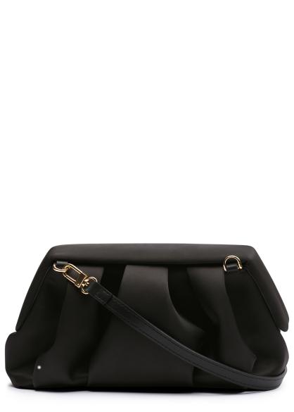 The Afrodite clutch from THEMOIRÈ is rendered in sleek black satin, its softly pleated surface lending sculptural elegance. A hinged top and hidden frame complete the refined, modern silhouette.