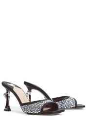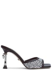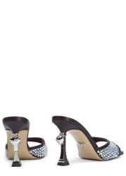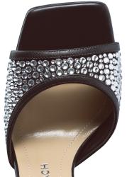The Puffy Heart Ring mules from Mach & Mach are crafted in leather with crystal-studded straps for striking allure. A sculptural heel suspends logo-engraved heart pendants, adding a playful yet glamorous finish.