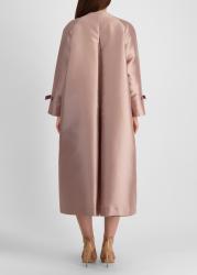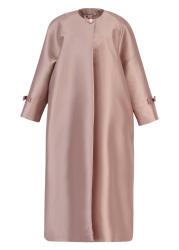 The David coat from Bernadette is crafted in sculptural silk-blend mikado, shaped in a fluid A-line silhouette with elegant front and back splits. A single oversized pearl button at the neck and refined bow tie cuffs complete the design with quiet, architectural polish.