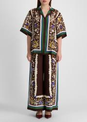 The Maroc trousers from Alémais are cut from airy linen and decorated with bold, folkloric motifs that frame the silhouette. A relaxed, wide-leg silhouette and elasticated waist complete their easy, artful appeal.