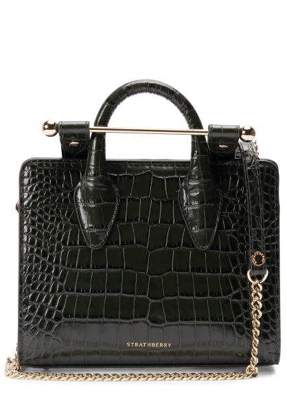 The Nano Tote from Strathberry is crafted from croc-embossed leather, shaped in a structured silhouette with signature Music Bar hardware. A sleek top handle and detachable chain strap complete this polished mini statement.