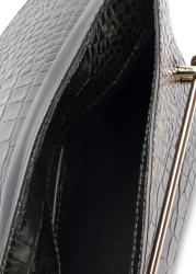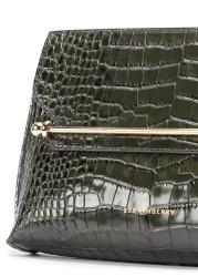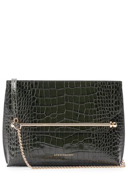The Stylist bag from Strathberry is crafted from croc-embossed leather in a sleek clutch silhouette, finished with the signature Music Bar and a detachable gold chain for refined day-to-evening versatility.