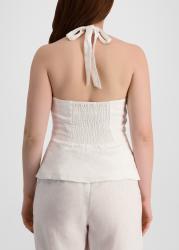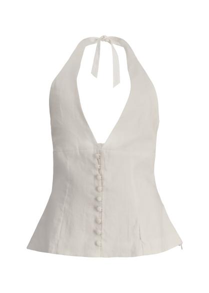 This top from Aexae is crafted from airy linen in a halterneck silhouette, defined by a plunging neck and a softly flared hem. Button detailing traces the front, while an open back with elasticated smocking and playful ties lends a sculpted yet effortless finish.