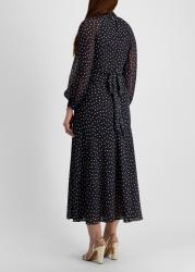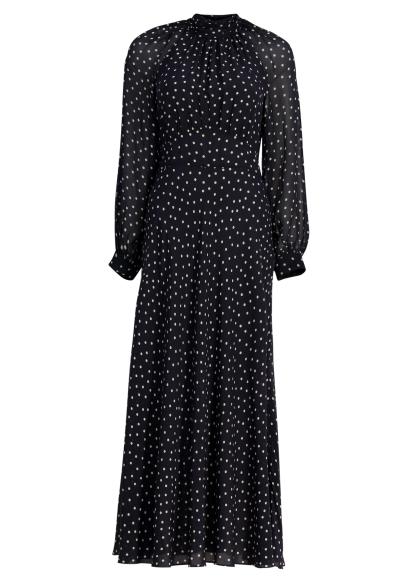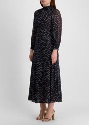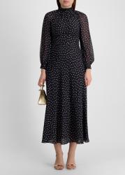 The Paige midi dress from Rixo is crafted from airy silk chiffon adorned with polka dots, lending timeless vintage charm. This signature style features a gathered mock neck, sheer blouson sleeves, and a cinched waist that balance the fluid silhouette.