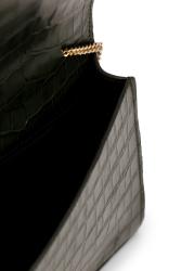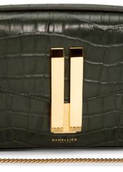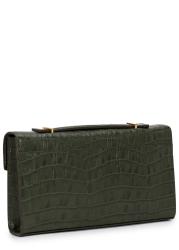 The Vancouver clutch by DeMellier is crafted from croc-embossed leather, shaped in a sleek, structured silhouette with a curved top handle and a signature double-bar lock. A fine chain strap adds versatile styling.