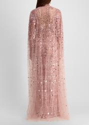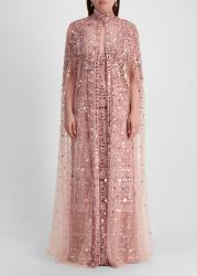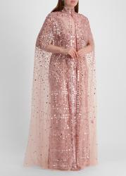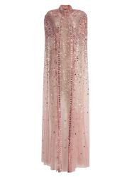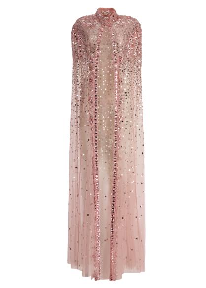 This cape from Zuhair Murad is crafted from sheer tulle, intricately adorned with sequins and beads arranged in ornate geometric and floral motifs. Framed by a highly embellished collar, this signature style falls in a fluid floor-length silhouette, bringing dramatic movement and statement elegance to the look.
