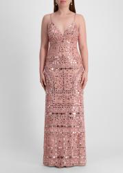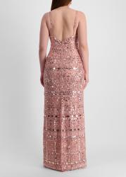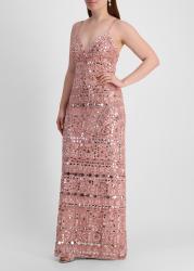 This dress from Zuhair Murad is crafted from sheer tulle, richly embroidered with intricate beadwork, crystals, and sequins arranged in ornate geometric motifs. Shaped with slender straps and a plunging V-neck, this signature style falls into a sleek floor-length silhouette that captures radiant couture glamour.