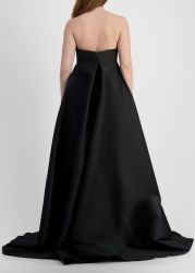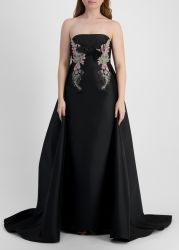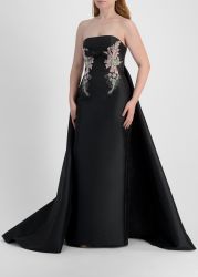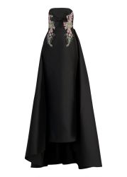 This gown from Zuhair Murad showcases couture artistry in lustrous mikado, cut in a strapless silhouette. Crystal-embroidered motifs and a chic bow frame the sculpted bodice, while the dramatic floor-sweeping train enhances its regal allure.