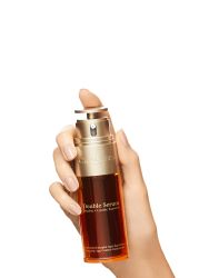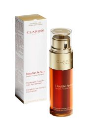 - Clarins Double Serum 30ml or 50ml is a Complete Age Control Concentrate formulated to help work on the 5 vital skin functions for visibly younger looking skin. Clarins Double Serum acts on the appearance of major signs of skin-aging and contains 21 active plant extracts, including turmeric. Turmeric is renowned for its exceptional anti-aging properties. The bottles rotating push button delivers a made-to-measure dosage of serum. Skin is left looking more radiant, firmer, and fine lines are smoothed.