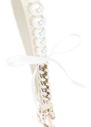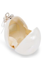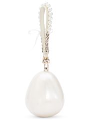 The Egg clutch from Simone Rocha is a sculptural statement piece, crafted in an oval-shaped silhouette, suspended from a tonal leather wristlet and finished with a faux pearl-embellished strap.