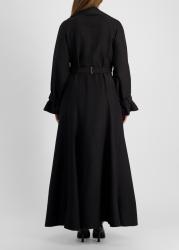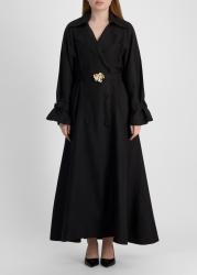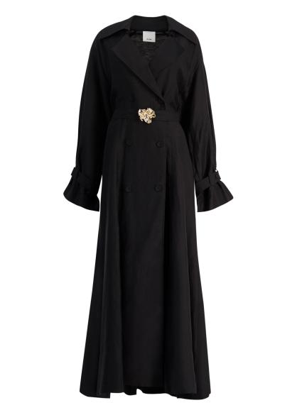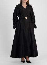The Evehill dress from Acler reimagines a trench-inspired silhouette in a linen blend, featuring sharp lapels, soft volume throughout the sleeves, and a full-length skirt. A sculptural gold-tone buckle belt punctuates the waist with understated glamour, bringing polished contrast to the refined double-breasted design.