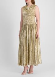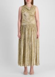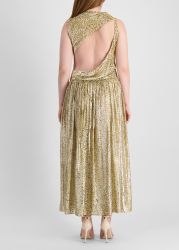This maxi dress from Self-Portrait captures high-octane glamour in metallic jacquard, featuring a draped bodice, sleeveless cut, and a drop waist that falls through a finely pleated skirt. An asymmetric open back adds a dramatic twist, making it perfect for after-dark moments.