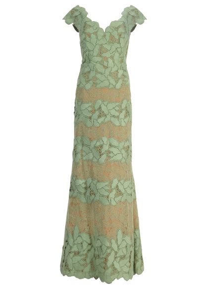 This gown from Elie Saab shapes the silhouette with a sculpted bodice, its leaf-like lace motifs embroidered over sheer tulle, falling into a voluminous skirt to deliver pure evening drama.