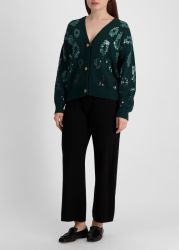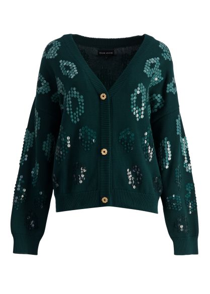This cardigan from Izaak Azanei is crafted from soft cotton in a deep forest green hue that exudes quiet luxury. Scattered sequins catch the light with every movement, adding a touch of playful glamour to its timeless silhouette.