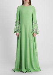 This kaftan from Oscar De La Renta is cut from smooth, stretchy silk that drapes with quiet fluidity, creating a clean, elongated silhouette. The scalloped bell sleeves bloom with mirrored fern motifs, each hand-worked to catch the light with sculptural brilliance.