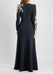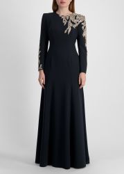 The Honor maxi dress from Jenny Packham is crafted from smooth beige crepe, featuring a graceful fit-and-flare silhouette and long sleeves adorned with shimmering crystal and bead embroidery that blooms across the structured shoulder and cuffs.